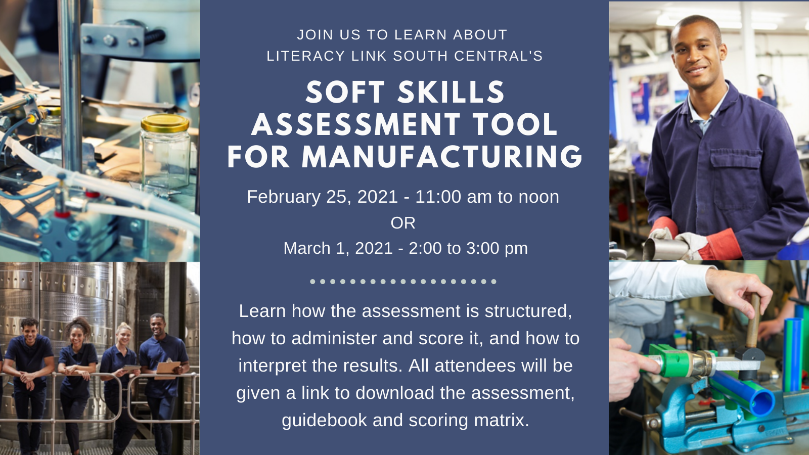 Literacy Link South Central will be offering information / training sessions to introduce our new Soft Skills Assessment Tool for the Manufacturing Sector. If you would like to learn more about assessing the soft skills of either job applicants or current employees, please join us for one of two live sessions: